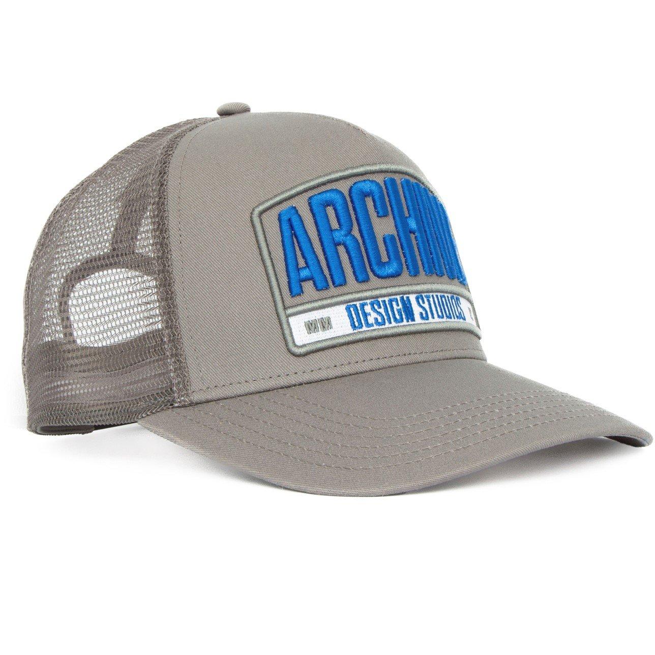 The Archive Sanford. A structured trucker cap with an embroidered patch to the front with high build Archive text. The Sanford has a snapback adjuster for a versatile fit.