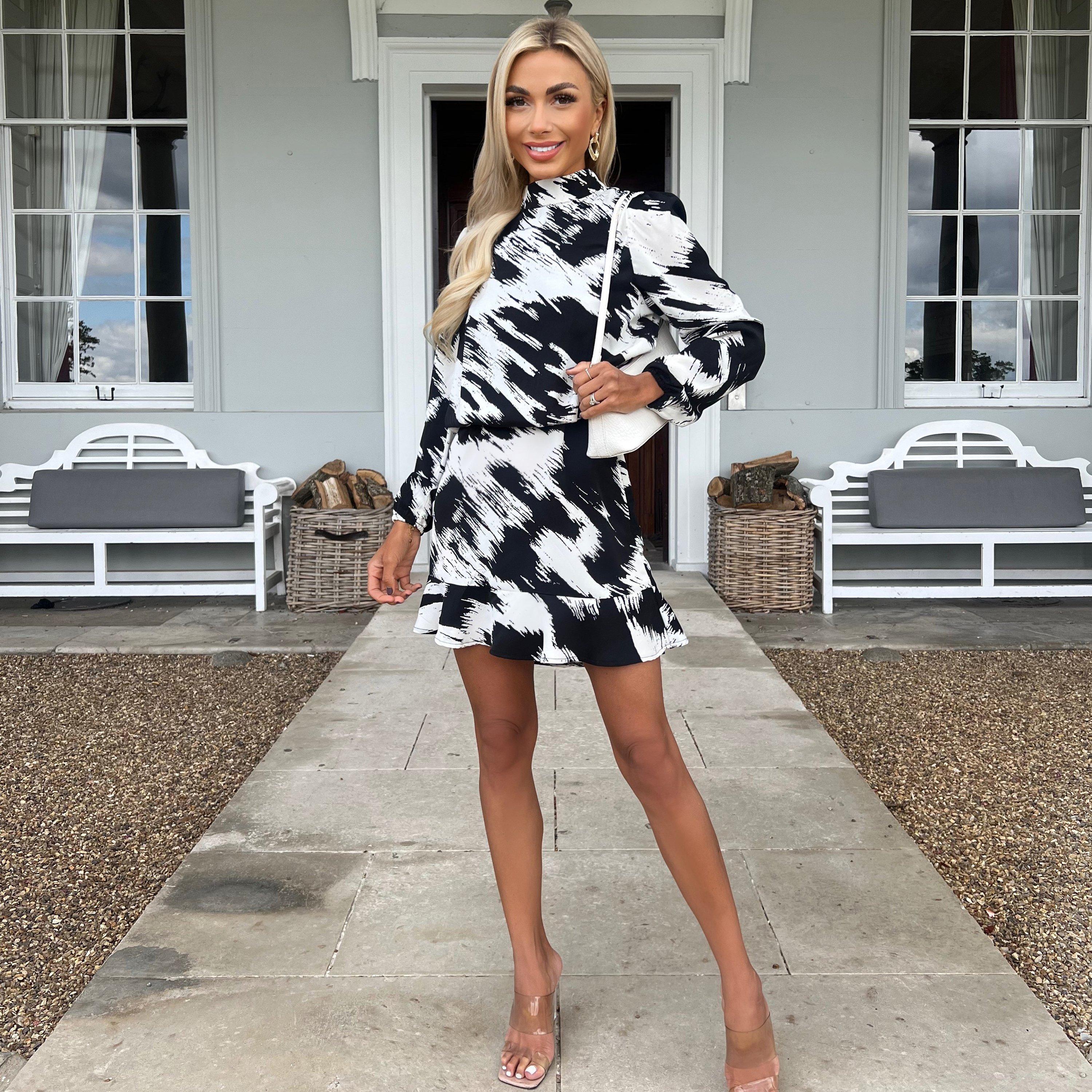 This versatile Black and White High Neck Long Sleeve Skater Dress will take you from morning meetings to dinner out in style. Featuring a high neck, long sleeves with elasticated cuffs, a zip up back, elasticated waist and mini length skirt. Keep it casual with flats or dress it up with killer heels and statement earrings.