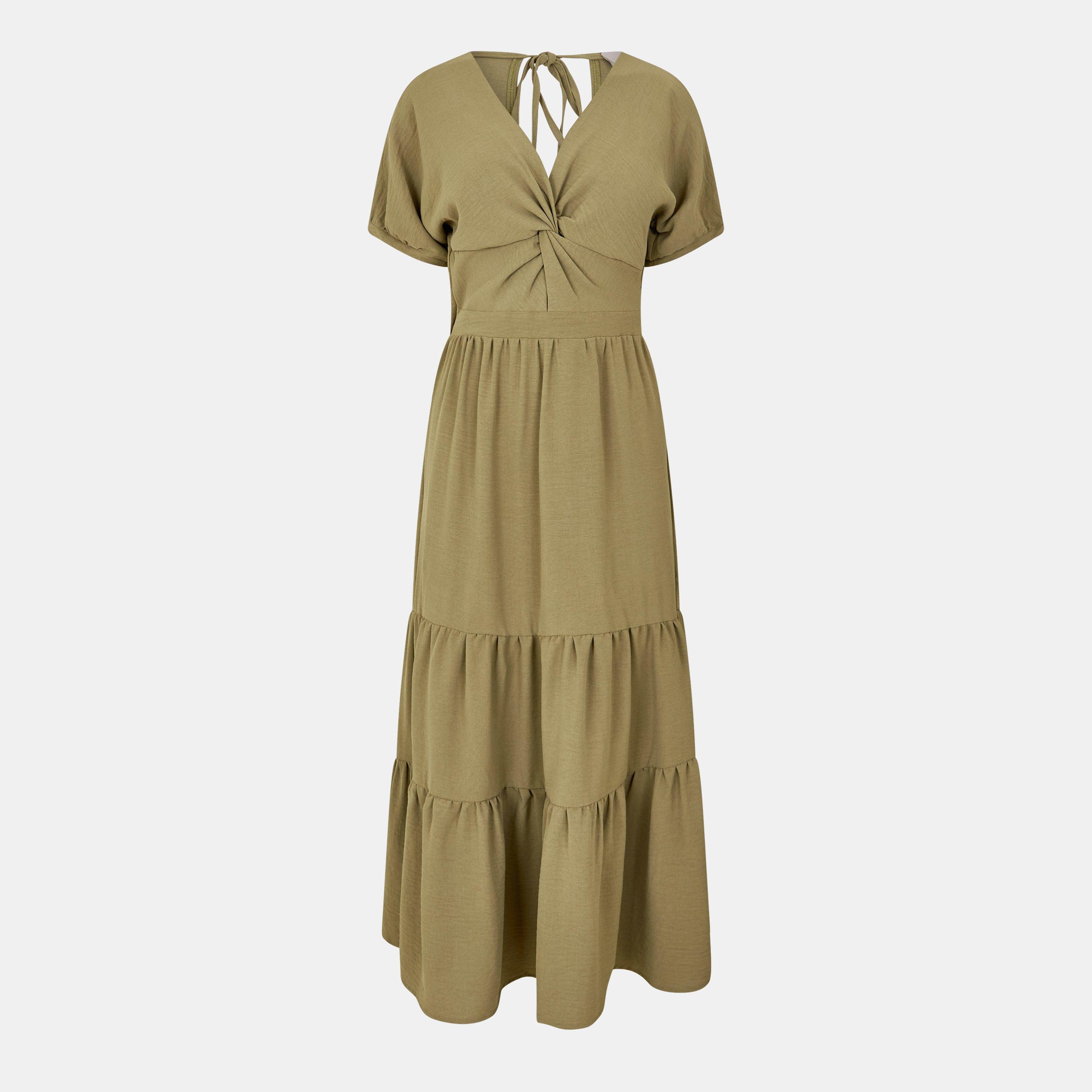 This Khaki Twist Front Maxi Smock Dress is a summer wardrobe staple. Featuring a twist front detail, short sleeves, an open back with tie detail and a tiered smock maxi skirt. Perfect for weekends, holidays and summer parties just pair with sandals and gold jewelry.