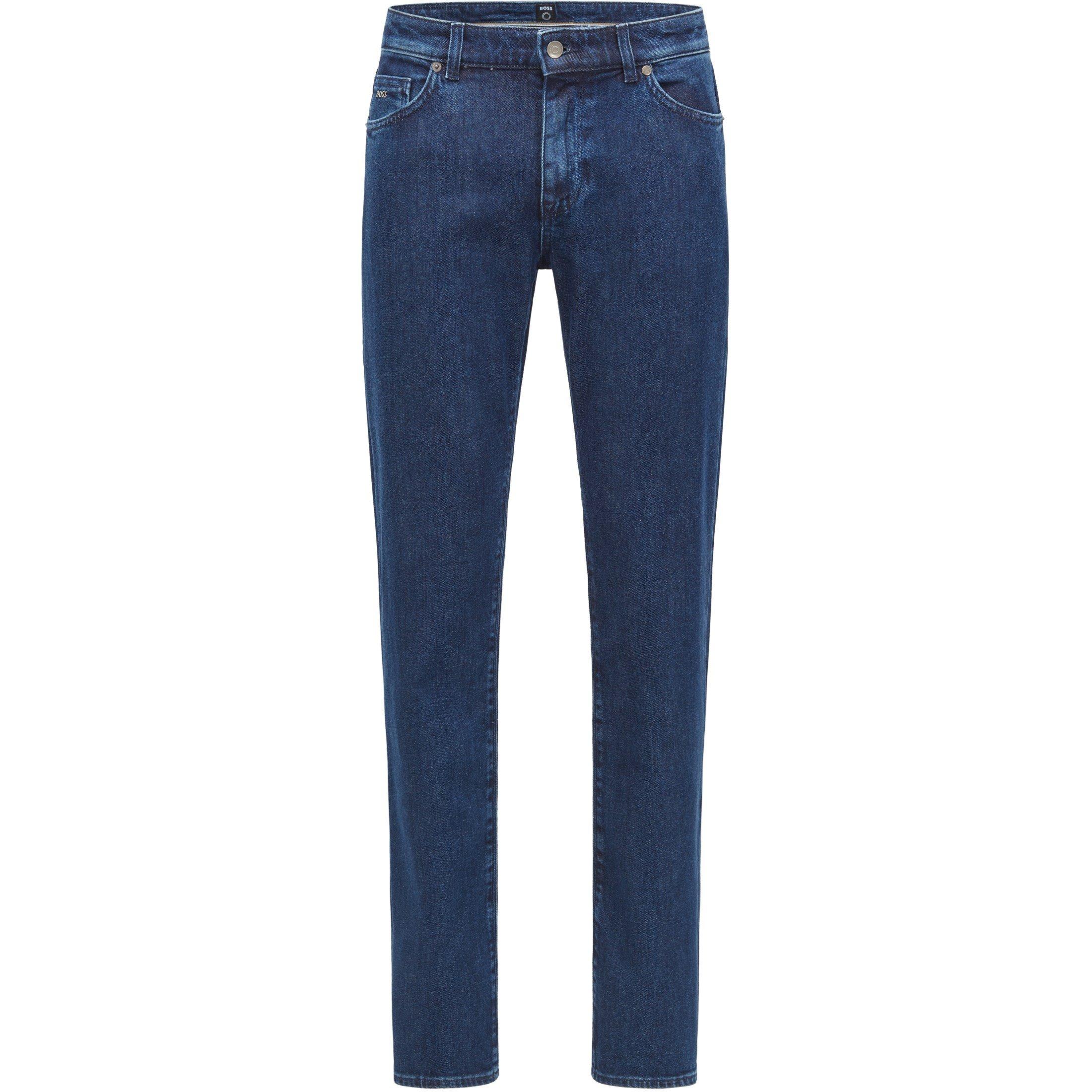 BOSS Maine straight jeans combine quality fabric with classic five-pocket styling for a regular fit. The contrast stitching and leather patch showcase authentic BOSS quality.