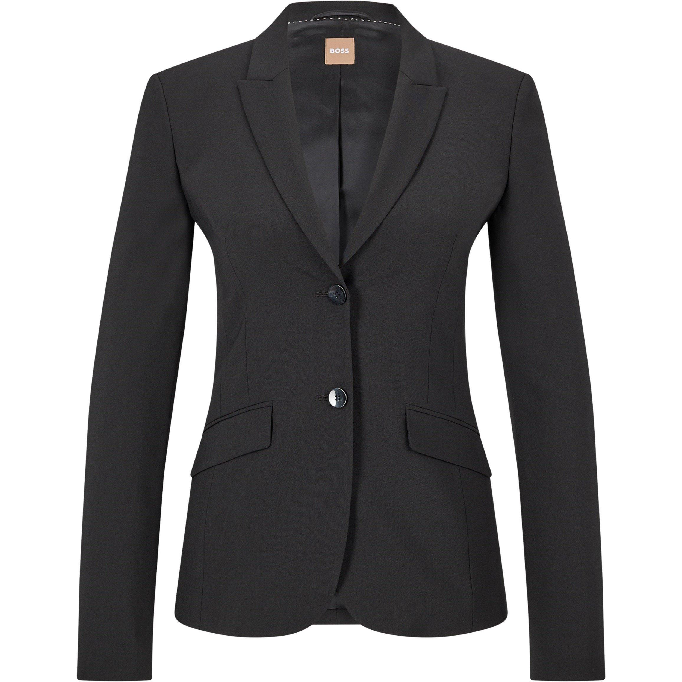 The BOSS Women's Julea Blazer features clean lines and a structured cut. This tailored jacket provides a professional look with a quality make that moves with you throughout the day.
