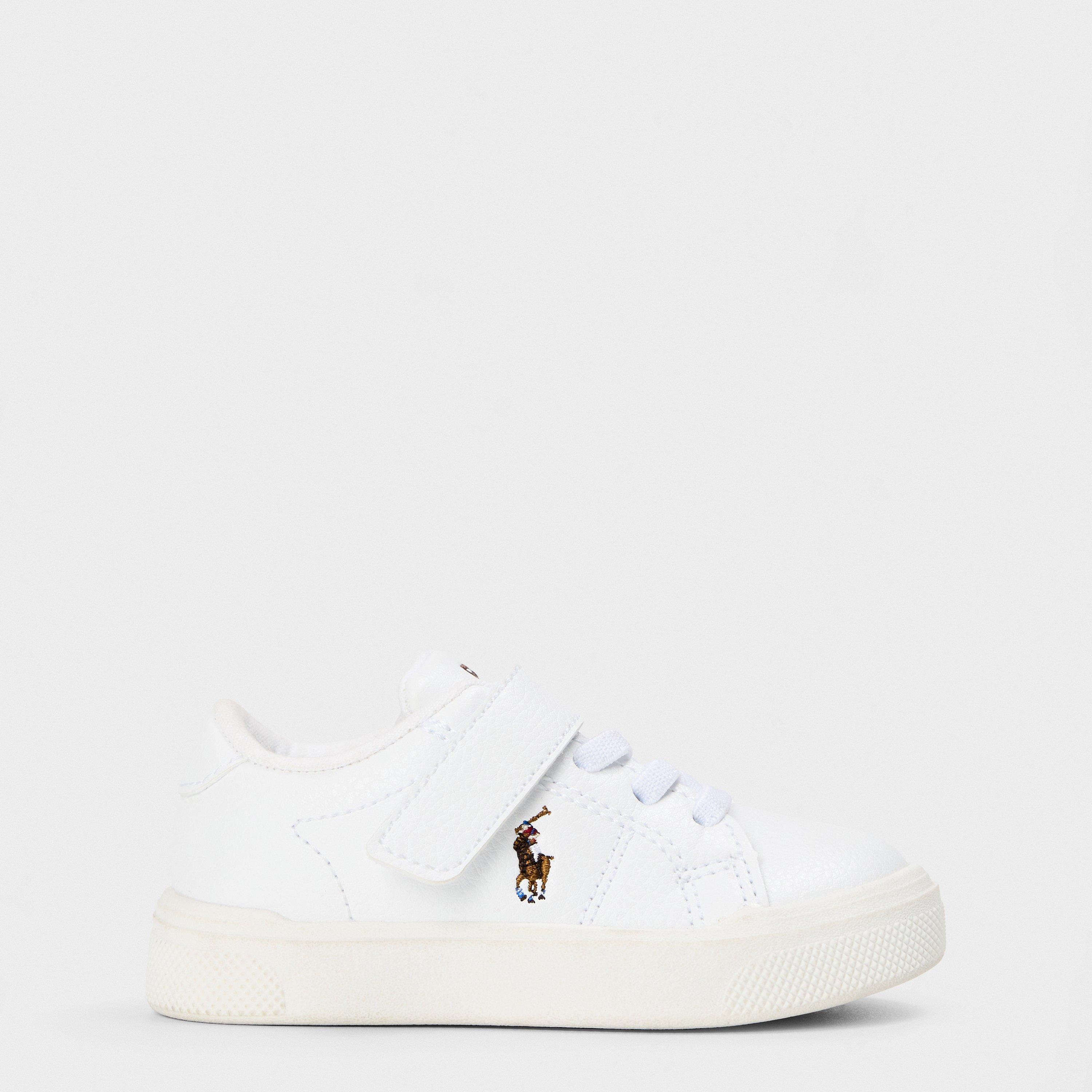 A fresh take on classic tennis style brings timeless appeal to these Polo Ralph Lauren trainers. The clean design features a smooth upper with the iconic polo player logo prominently displayed on the side. With a touch-and-close strap combined with traditional laces, these low-top trainers deliver both security and ease for active young feet. The robust rubber sole provides reliable grip, while navy accents create a smart contrast against the pristine base.