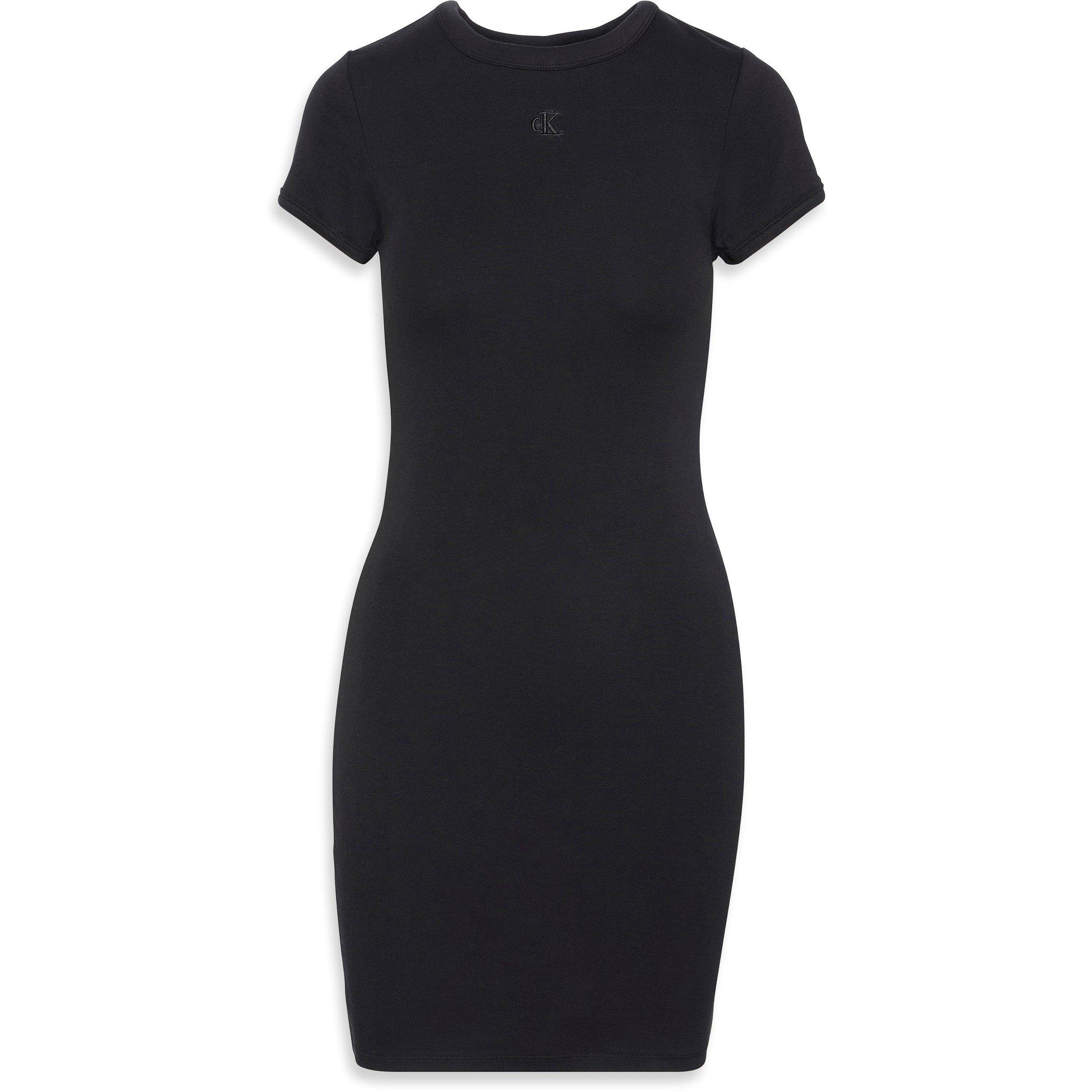 Calvin Klein Jeans' Short Sleeve Ribbed Mini Dress is cut with a figure-skimming fit for streamlined wear. The mini length offers a contemporary profile.