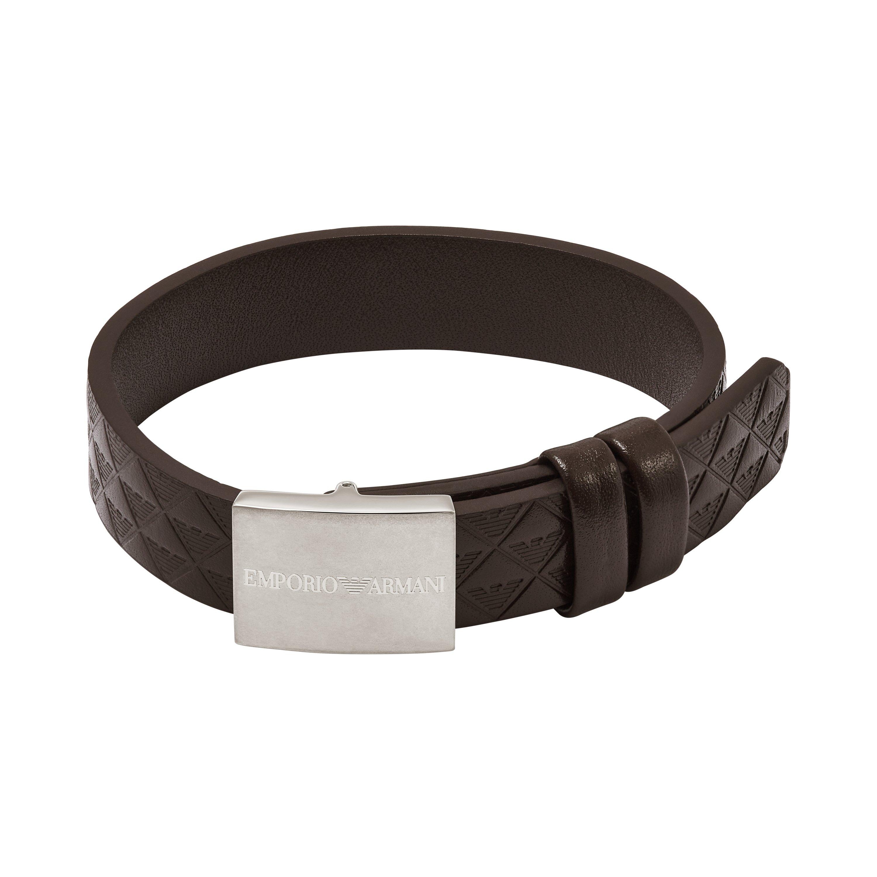 EGS3128040 - Emporio Armani's strap bracelet features black leather with eagle ID and a keeper closure. EGS3135040 - Emporio Armani's strap bracelet features black leather with eagle pattern and a keeper closure. EGS3126040 - Emporio Armani's ID bracelet features stainless steel and a jewelry clasp closure. EGS3127040 - Emporio Armani's cuff bracelet features stainless steel.