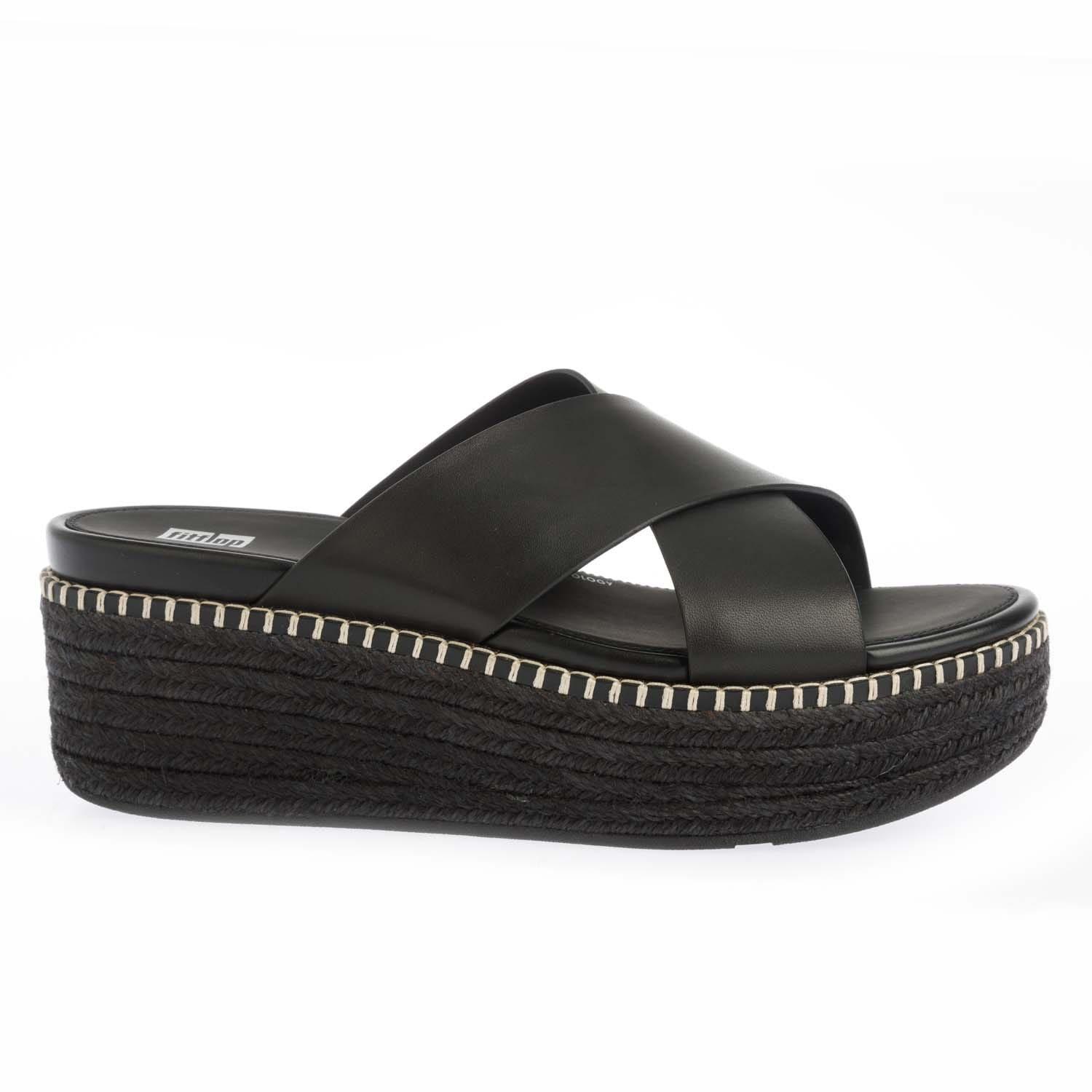 Womens FitFlop Eloise Espadrille Leather Wedge Cross Slide Sandals in black.