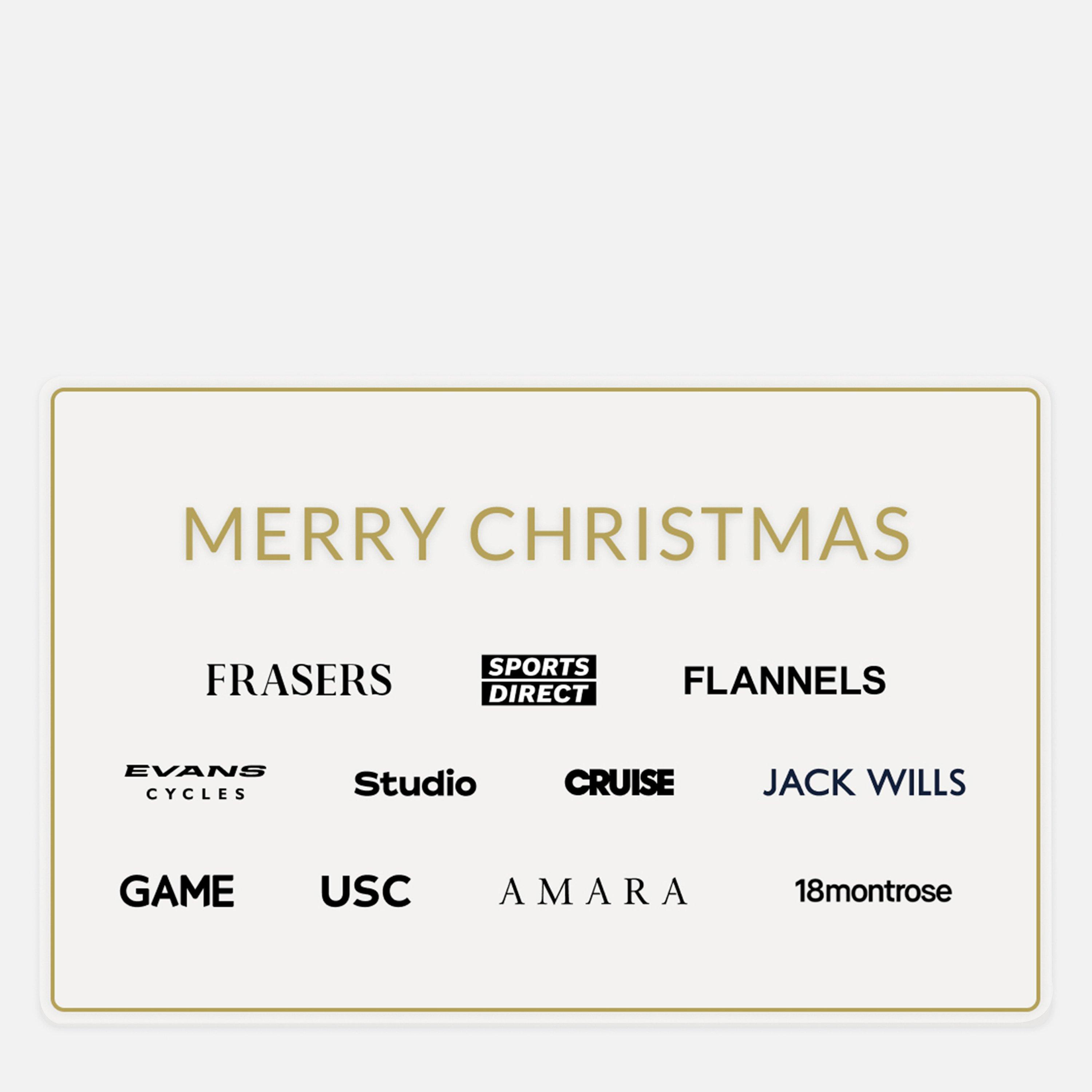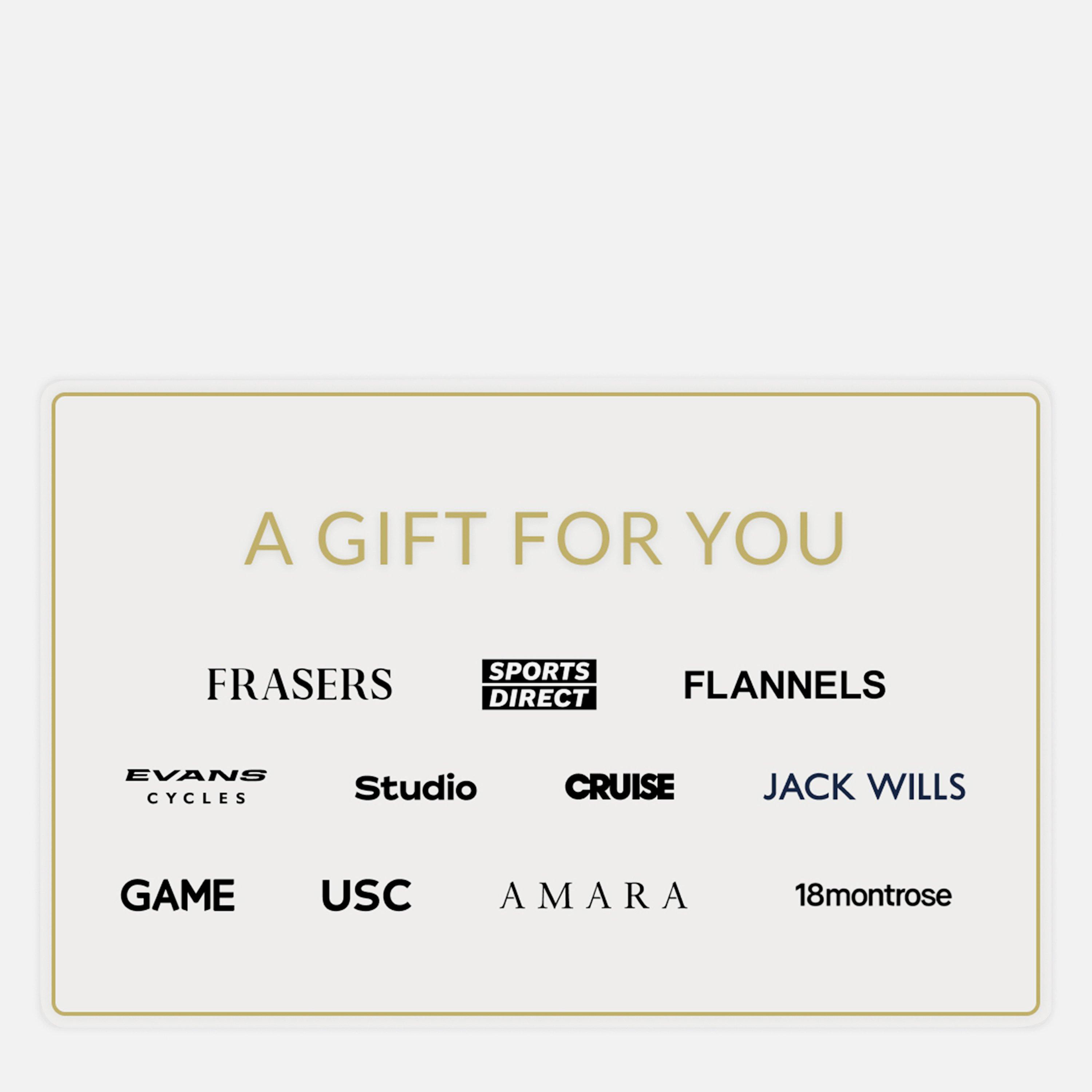 This E-Voucher Gift Card is the perfect option that suits anyone and everyone. Available to spend both in store and online, on anything from clothing to footwear to accessories, it's the ultimate gift that you can't get wrong! Stores include: Sports Direct, Flannels, House of Fraser, GAME, Studio, USC, Jack Wills, 18 montrose, scotts, Cruise, Evans Cycles, Amara, I Saw It First