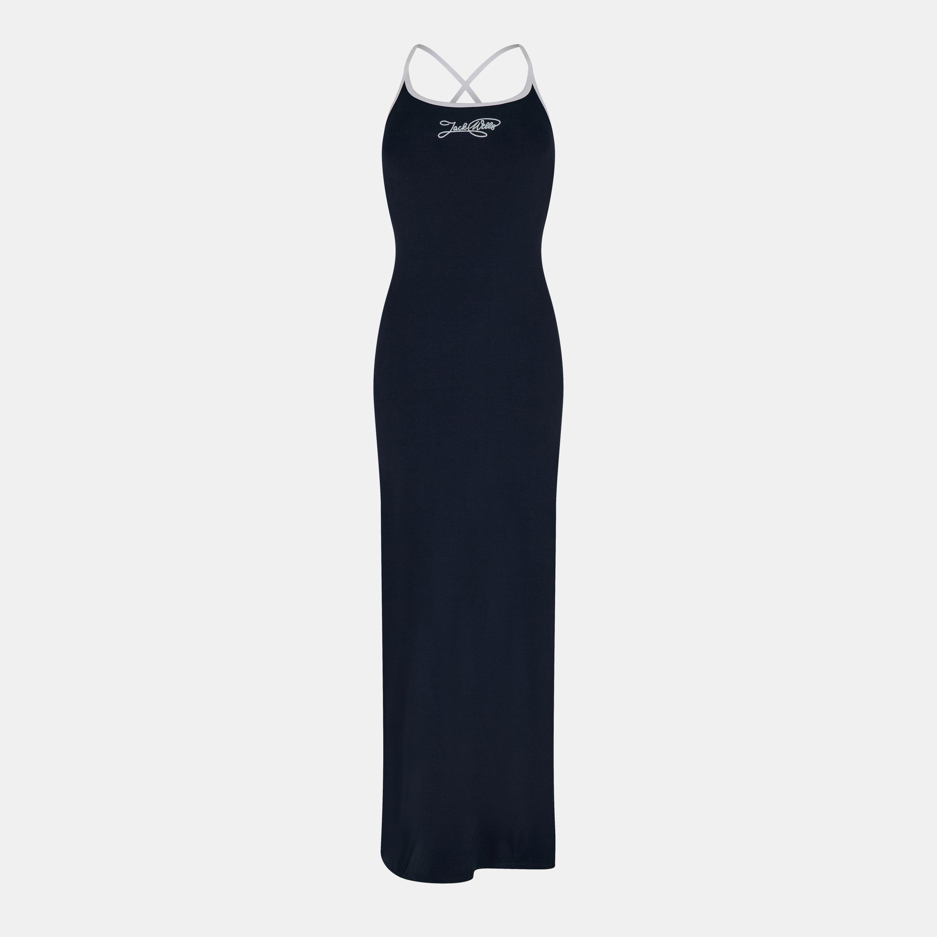 Jack Wills' JW Chain Stitch Maxi Dress for women features chain stitch embroidery, with flowing lines and a structured design. The long, floor-length style balances graceful drape with a tailored cut, creating a piece for any occasion.