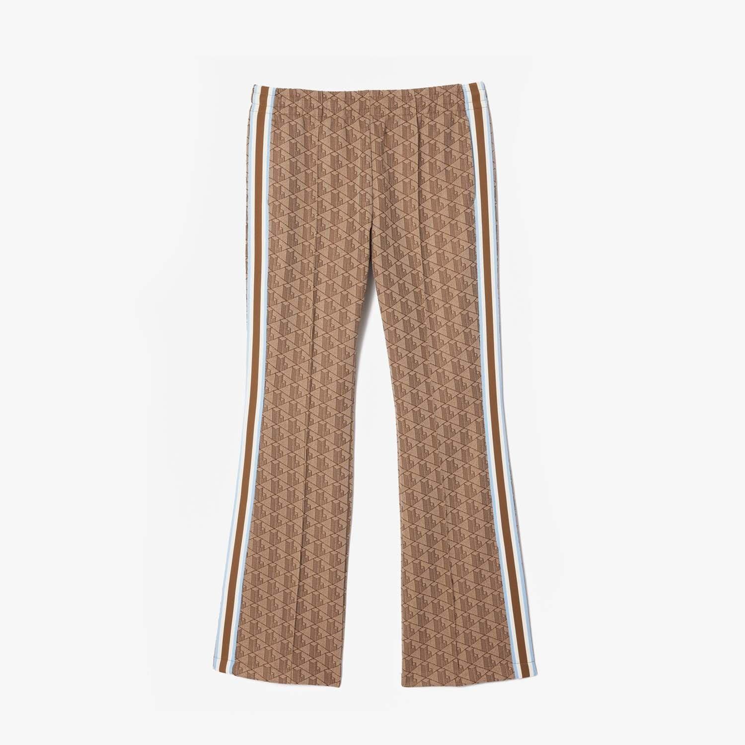 Womens Lacoste Flared Monogram Print Trackpants in beige.