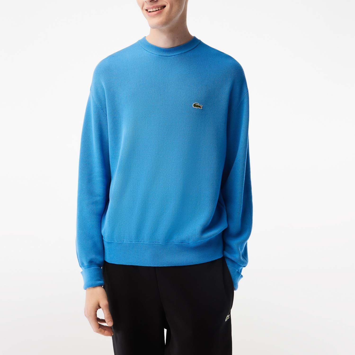 Men,s Lacoste Round Neck Organic Cotton Sweater Relaxed fit loose cut dropped shoulders: Hip relaxed cut. Round neck: Classic sweater style. Contrast seams: Details that,ll get you noticed. Crocodile on chest: A sign of quality. Organic cotton: Grown without GMO or chemical products.