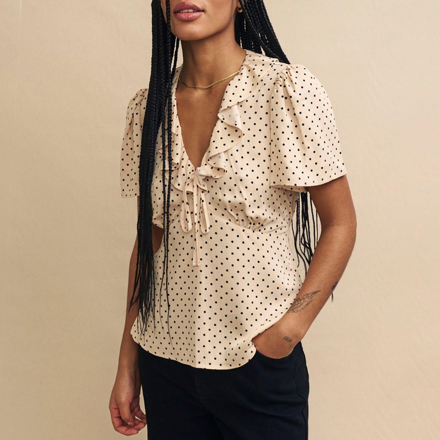 Every wardrobe needs a cute top like Joley. Woven entirely from responsible viscose she,ll infuse a little vintage-inspired romance into your look with her fluted sleeves and floaty ruffles. We love the cream polka dot print and the figure-skimming fit. Style yours with black jeans.