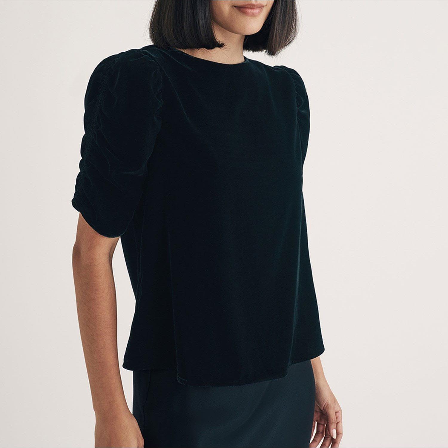 Your new favourite party top. Expertly crafted entirely from recycled materials this classic black velvet number comes with pretty puff sleeves and a relaxed silhouette for comfort and style. Turn around to show off the statement bow and keyhole detailing at the back. Dress it down in the day with denim or dazzle in a long slip skirt at night.