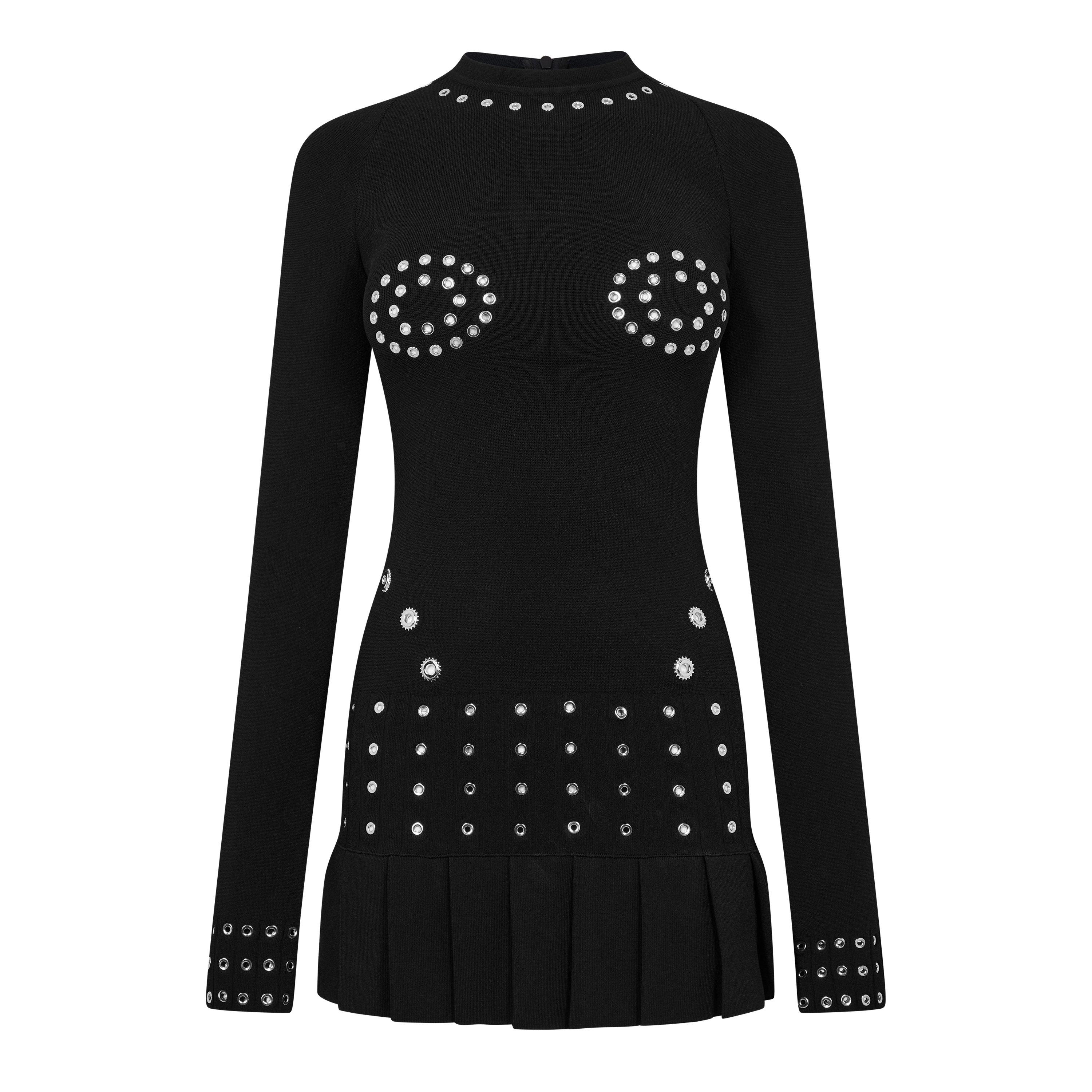 The Off-White Eyelet Pleated Mini Dress showcases delicate eyelet detailing and precision pleating throughout. This standout mini dress pairs a quality make with contemporary design, creating a special piece.