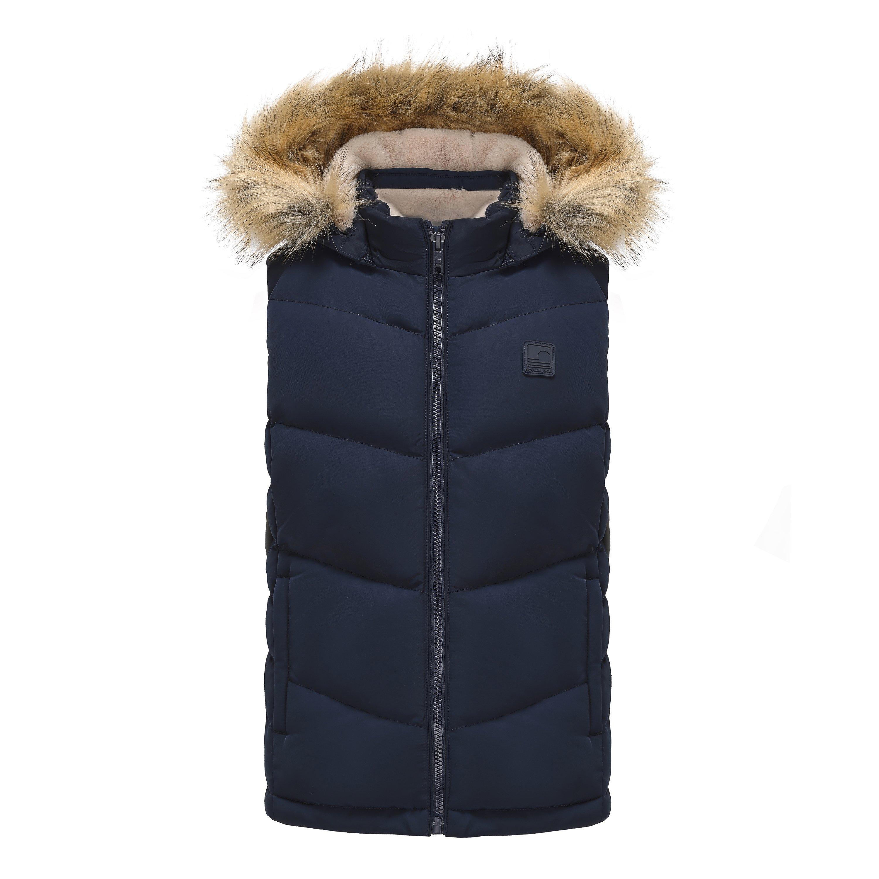 SoulCal's 2Zip Detachable Hood Padded Gilet features a double zip fastening system and soft lining for warmth. This vest offers a sleeveless design that includes a detachable hood with removable trim, allowing for different fashion styling options while maintaining core temperature in cooler conditions. It can be worn over other clothes as an alternative to heavier jacket options.