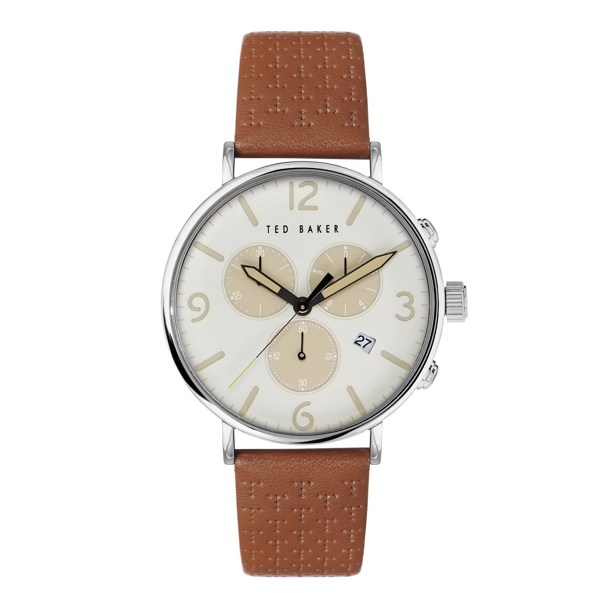Sign off your signature style with this Barnett Watch by Ted Baker. Crafted using a base metal for the case, mineral for the glass clock face and a sumptuous leather strap. this analogue watch effortlessly elevates your everyday ensemble. Secured with a strap buckle and movement powered by quartz this stylish look is designed in an emboldened colourway making it versatile enough to go with whatever attire, and with 50 meters of water resistance don't worry about taking it off when you wash your hands, it's also perfect for swimming with. Comes in luxury branding and with a 2 year guarantee.Not recommended for high impact water sports. Case width 41mm.