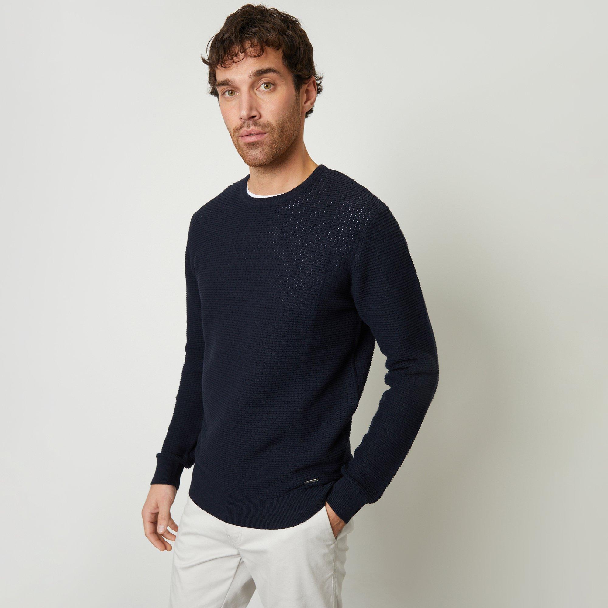Upgrade your knitwear staples with this crochet knit jumper from Threadbare. In a textured crochet knit, this crew neck jumper is made from cotton blend recycled yarns and is designed for everyday wear. Made in a regular fit with ribbed cuffs and hem and finished with the signature Threadbare metal hem badge for brand recognition. Pair with chinos or jeans for a smart casual everyday outfit.