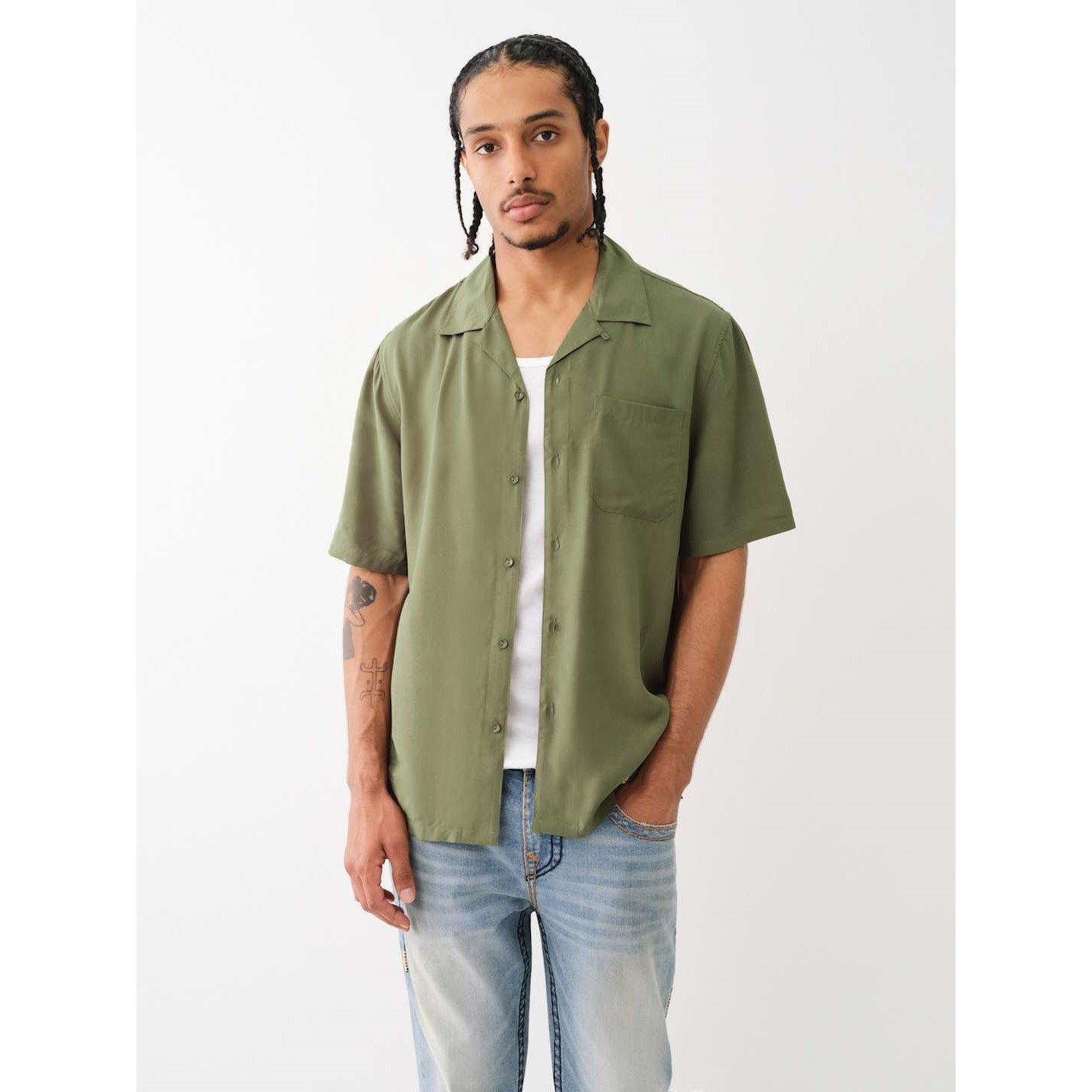 True Religion's Camp Collar Short-Sleeve Plain Shirt delivers smart casual style with its clean lines and relaxed shape. The camp collar creates an easygoing look great for warm-weather styling.