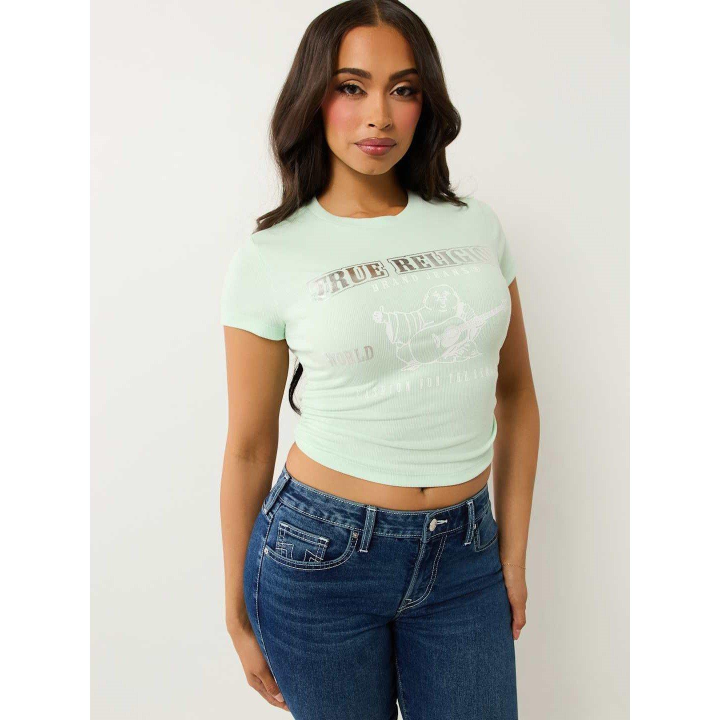 True Religion's Gathered Regular Fit T-Shirt for women offers casual style with textural appeal. The gathered detailing introduces dimensional texture while preserving a flattering shape.