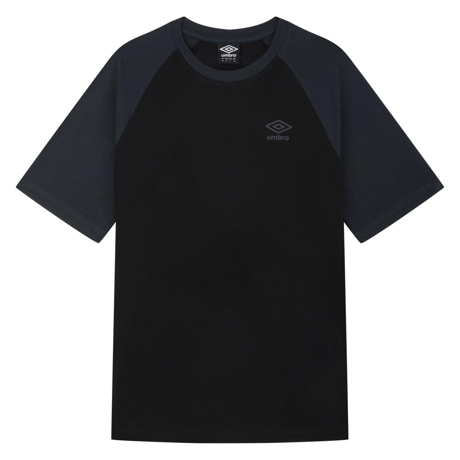 Ribbed crewneck. Raglan sleeves. Contrast woodland grey sleeves and collar. Umbro brand motif at left chest. Soft cotton jersey fabric. Regular fit.