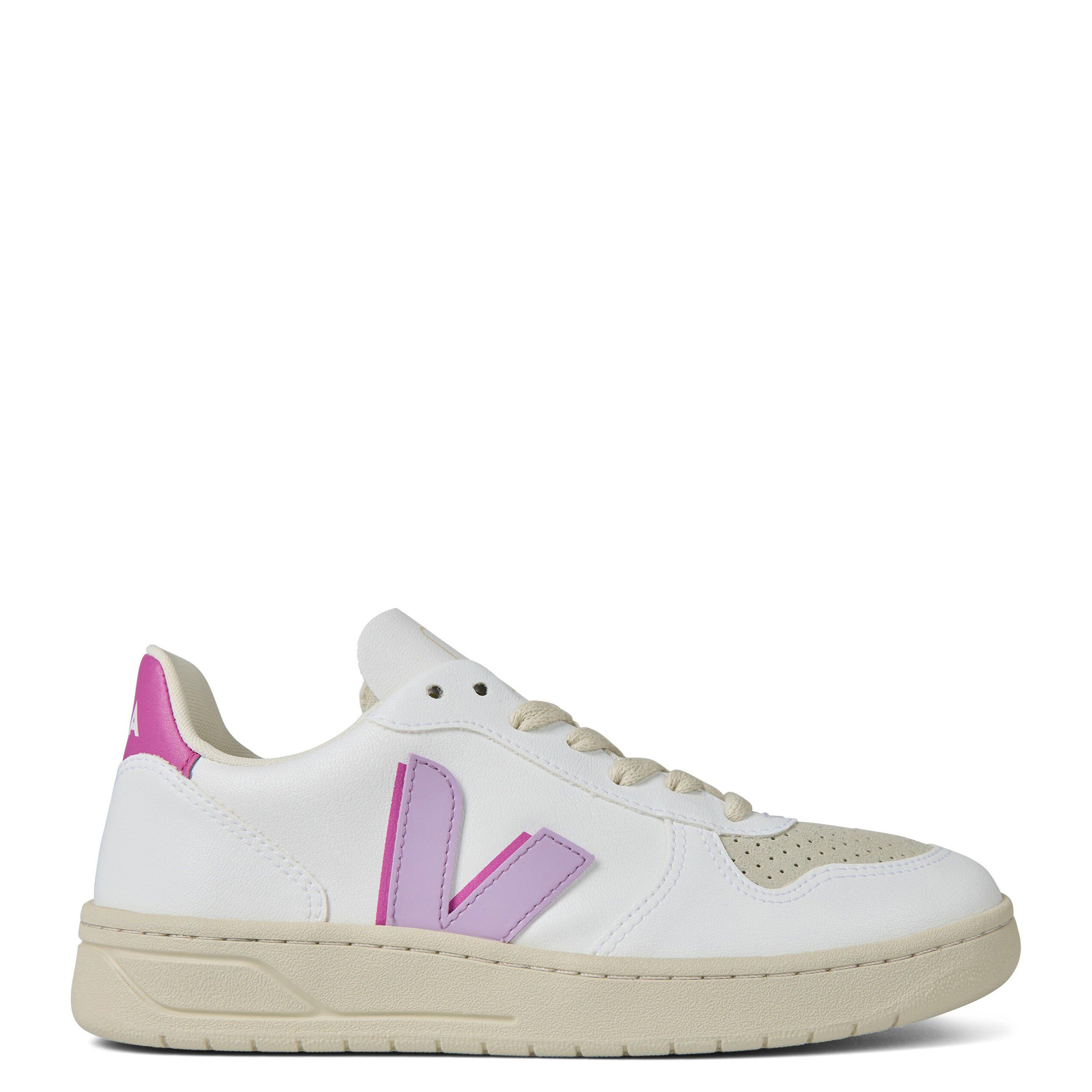 The VEJA V-10 Panelled Trainers feature a sleek design with a round toe cap, perforated detailing, and a lace-up front. Distinct branding includes a logo on the tongue, contrast heel tab, and embossed footbed. Crafted for both style and comfort, they’re ideal for casual outings, weekend brunches, or laid-back urban strolls.